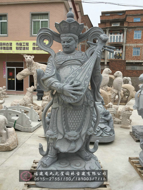 石雕東方持國(guó)天王.名多羅托,身著白色,穿甲胄,手持琵琶琴。用琵琶彈奏,使之缽依佛門,以音樂(lè)感化眾生護(hù)持國(guó)土。其職責(zé)是:保護(hù)東方國(guó)土,保護(hù)眾生,保護(hù)東方弗提婆洲人民。