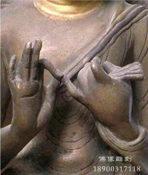 佛像的各種手勢代表佛像的不同身份,表示佛教的各種教義,是具有印度特點(diǎn)的人體語言,表達(dá)的含義極為豐富。常見的有說法印、無畏印、與愿印、降魔印、禪定印5種,即“釋迦五印”。手印形式可有多種變化,尤其是密教手印多達(dá)幾百種,變化莫測,見的有智拳印、期克印等。