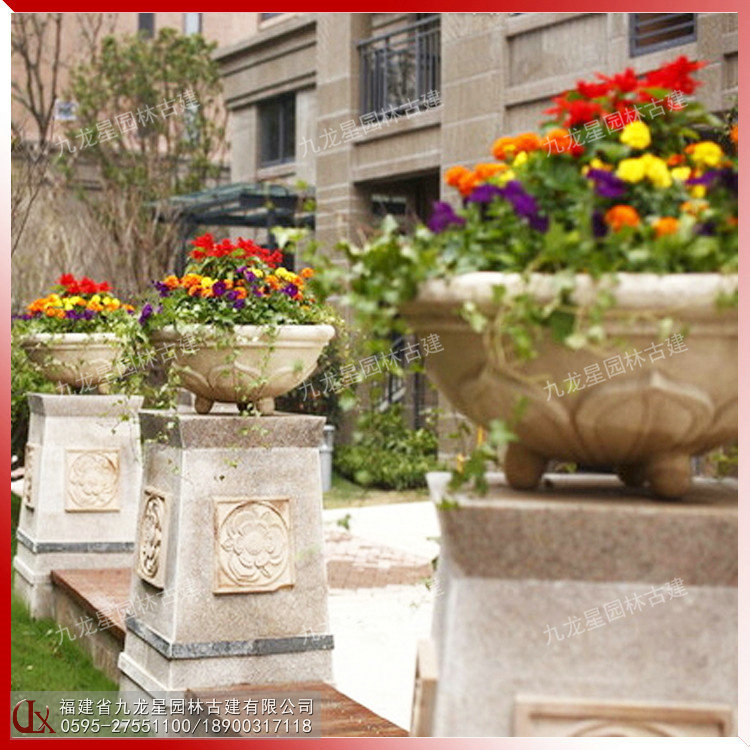 福建石材花缽批發(fā)-九龍星園林古建。石材花缽靈活多樣,隨處可用,尤其對于城鄉(xiāng)建筑比較密集和其他一些難于綠化地區(qū)的美化,有著特殊的意義。石材花缽的擺放可根據(jù)缽、盆樣式、大小的不同,進(jìn)行多種多樣的藝術(shù)組合。組合的形式可以是幾何式、自然式、混合式、集中布置、散置等,具體布局形式可根據(jù)要美化地點的情況決定。在較寬敞的地方,如廠前區(qū)、廣場、大型建筑門前、道路交叉口、停車場等處,石材花缽可布置為樣式多變、五彩繽紛的小花壇,在商店、住宅的門前亦可隨機點綴一二。