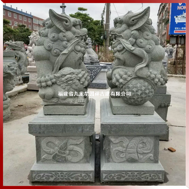 南派石獅子雕刻豐富,多彩有別,獻(xiàn)錢獅則是南派石獅子造型代表之一,因其以飾一串古錢而得名。因此,獻(xiàn)錢獅有著招**進(jìn)寶的寓意,因為造型憨態(tài)可掬,少了幾分獅子的威嚴(yán),多了幾分靈性,雄獅常飾于大串的銅錢,寓意招**進(jìn)寶。而雌獅則戲玩著小獅子,寓意人丁興旺之意,同樣也是人們熱衷于選擇的造型之一。獻(xiàn)錢獅是中國石雕獅子造型中常見的一種,同樣常見的還有北方傳統(tǒng)的京獅石雕獅子。