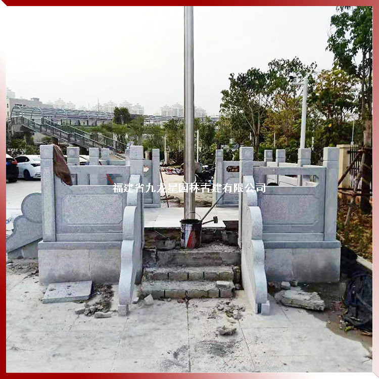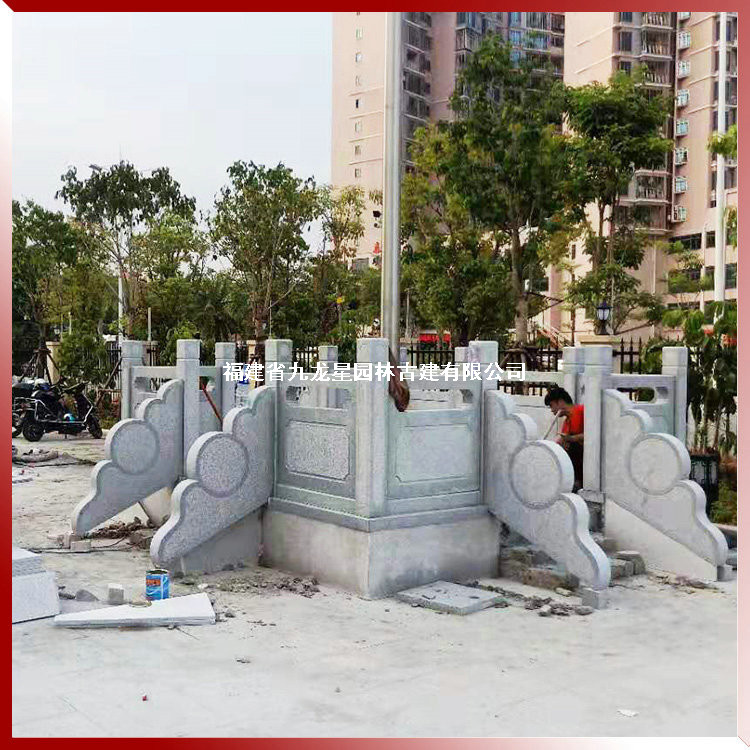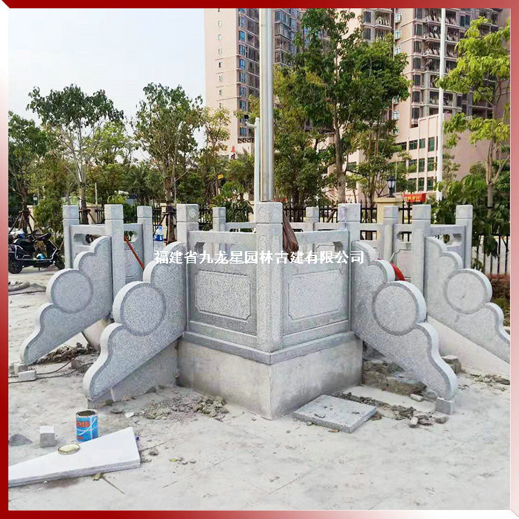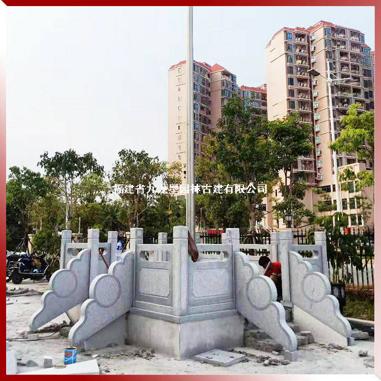 上圖石雕旗臺(tái)護(hù)欄,學(xué)校升旗臺(tái)石欄桿選用天然石材花崗巖生產(chǎn)加工,欄桿構(gòu)件有立柱、柱頭、欄板、抱鼓等幾部分組成,由九龍星園林古建制作安裝。