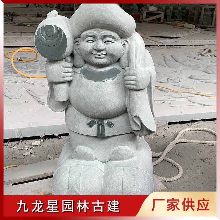 大黑天神的形態(tài),多數(shù)是面帶笑容,右手拿打金錘(賜財(cái)福),左手則執(zhí)著米袋(代表豐衣足食)。
