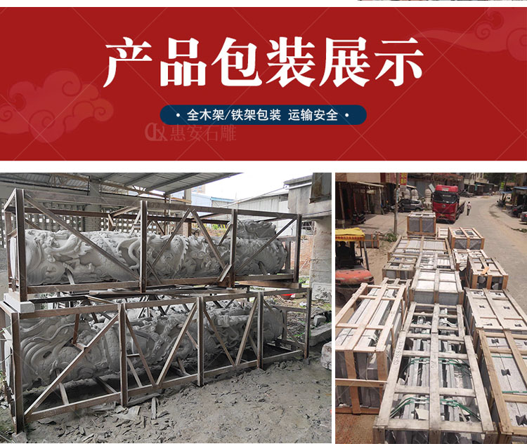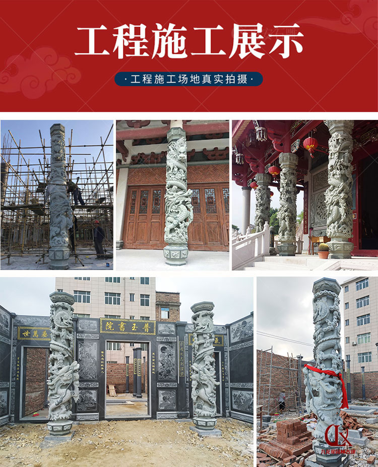 福建廠石雕龍柱產(chǎn)品構(gòu)成為柱礎(chǔ)、柱身、柱頭(柱帽)三部分,龍柱一般為圓柱形,通身雕刻有纏柱云龍,適用于宮觀寺院、宗祠古厝、園林景觀、廣場擺件等,常用石料為花崗巖與青石。