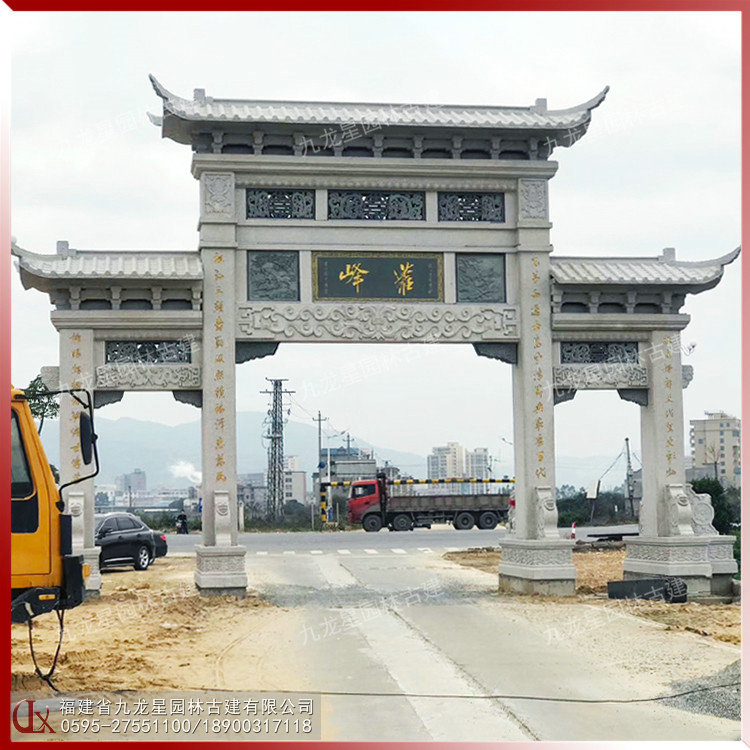 石雕三門牌坊,三門三樓石雕牌坊圖片,由石牌坊制作廠家九龍星園林古建制作。從石牌坊圖片來看,三門三樓石雕牌坊在不同場所應(yīng)用是比較多的,像農(nóng)村石牌坊、村莊石牌坊、宗祠石牌坊、墓地石牌坊、景區(qū)石牌坊、寺院石牌坊等,都有三門三樓石雕牌坊的身影。中國傳統(tǒng)的石雕技法圓雕、透雕、高浮雕、淺浮雕、平浮雕、陰線刻等,在三門三樓石雕牌坊的雕刻中廣為應(yīng)用。