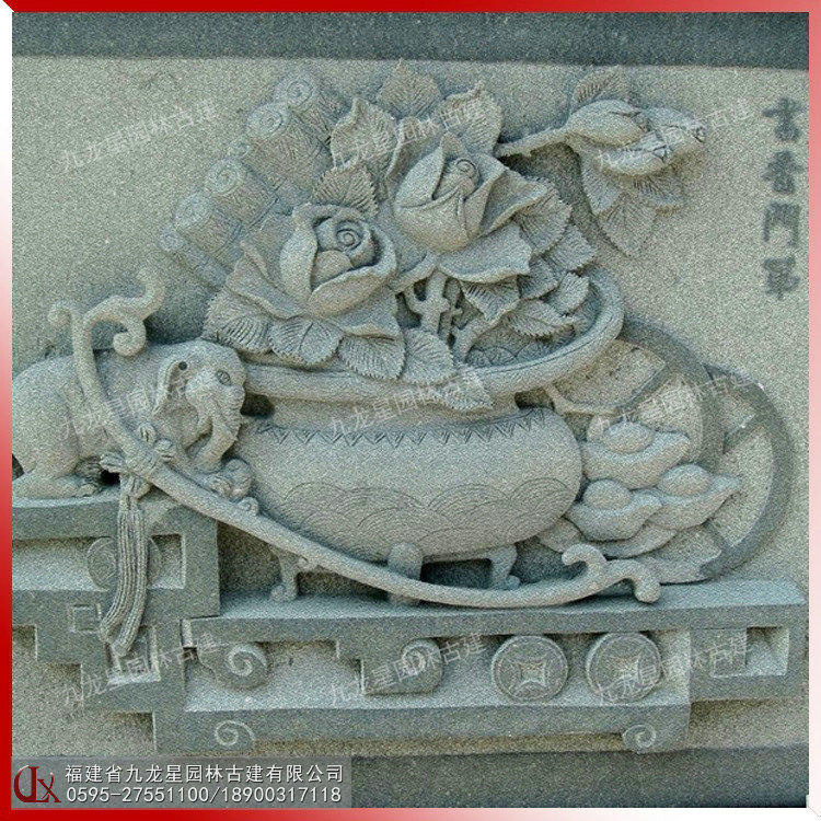 常見傳統(tǒng)寓意浮雕紋樣內(nèi)容有:花開富貴、喜鵲報(bào)喜、丹鳳朝陽(yáng)、太平有象、鹿竹同春、麒麟獻(xiàn)瑞、麒麟送子、松鶴延年、壽比南山、八仙祝壽、紫氣東來(lái)、五福臨門、招財(cái)進(jìn)寶、吉慶有余、五谷豐登、龍鳳呈祥、平安如意、歲歲平安、年年有余等生活風(fēng)俗或神話故事中富有美好寓意的吉祥圖案。