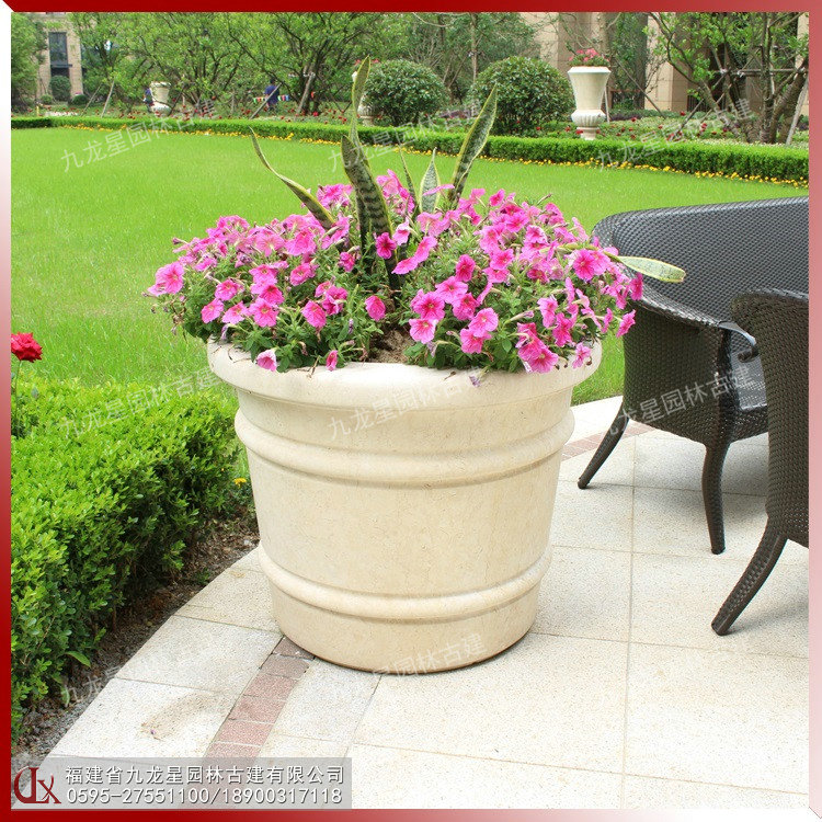 現(xiàn)代石雕花缽的造型不僅僅只是一個花缽,更是兼?zhèn)淞擞^賞功能的藝術品。用一整塊石頭采用傳統(tǒng)工藝雕琢而成,其文化味也是十足的。加上花卉的點綴,更具有一種孤芳自賞的美感自然流出。